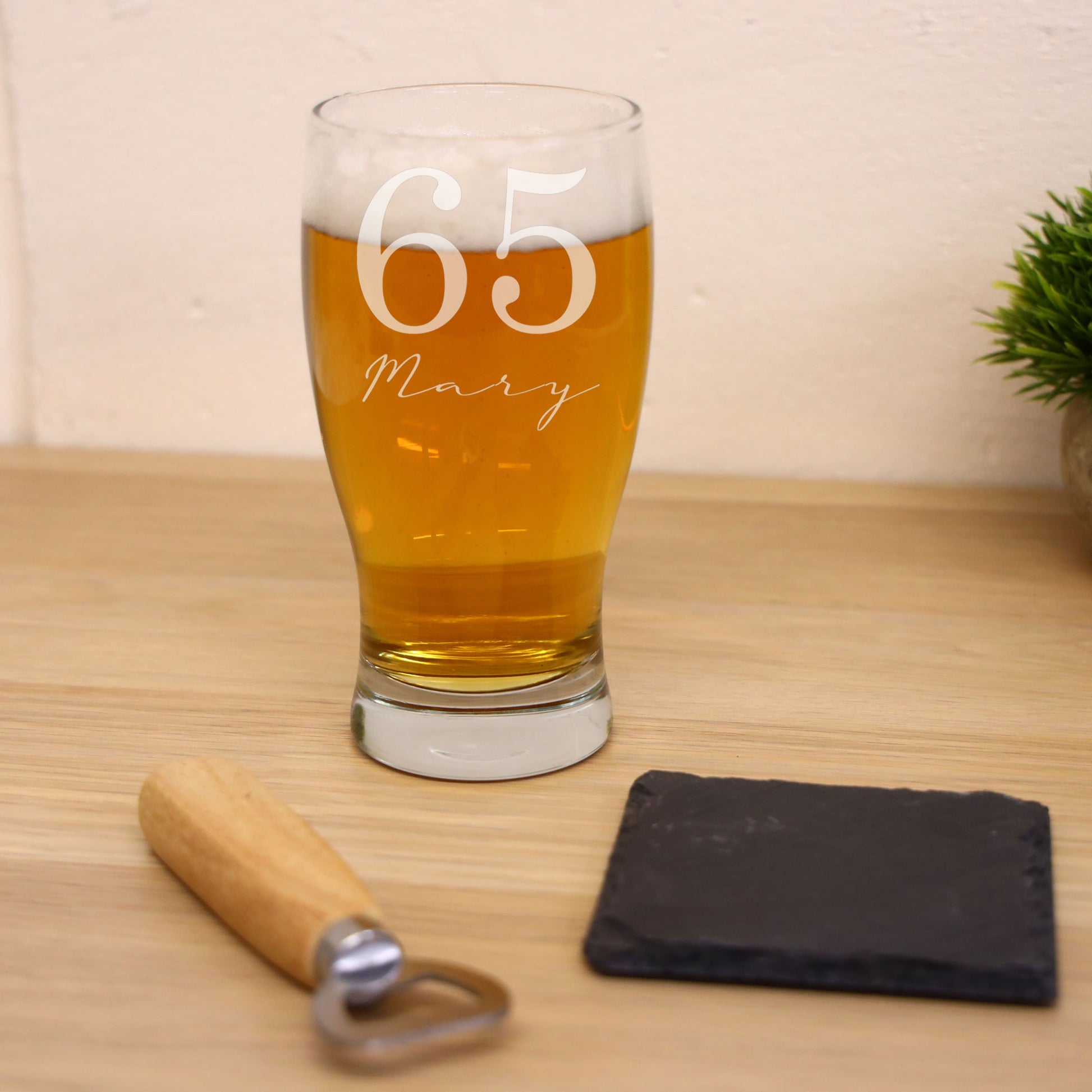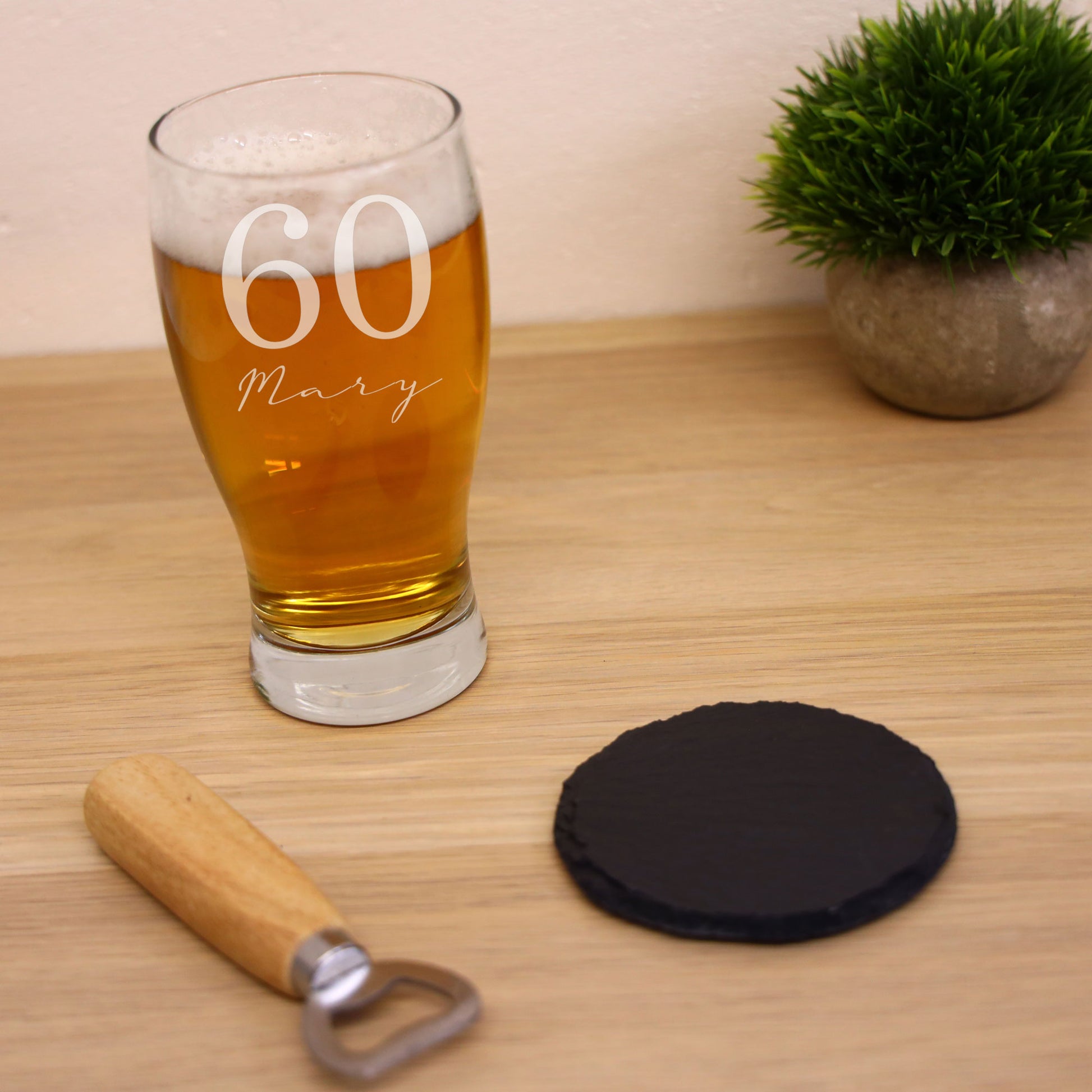 Engraved Age & Name Pint Glass & Coaster Set – Personalised Birthday Gift