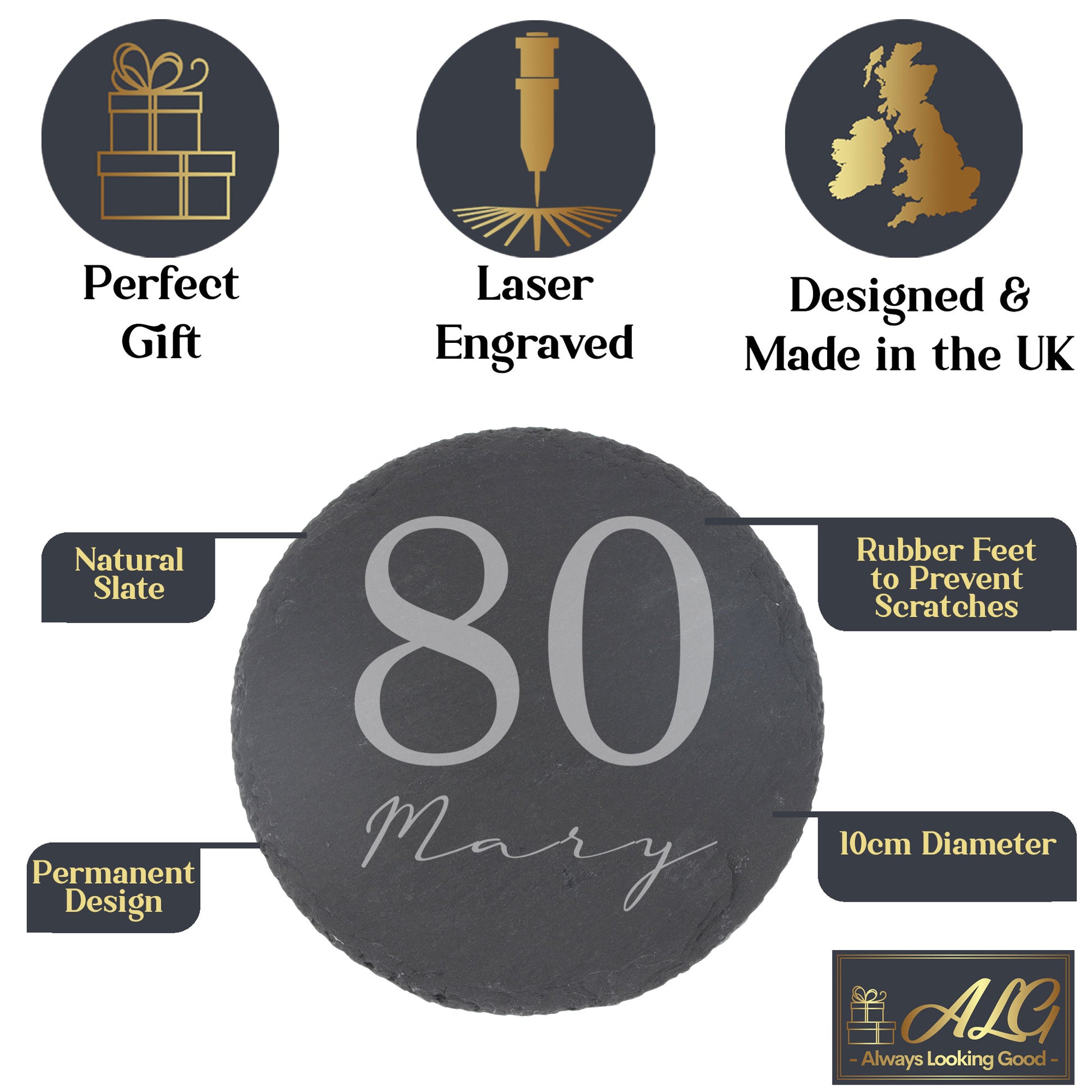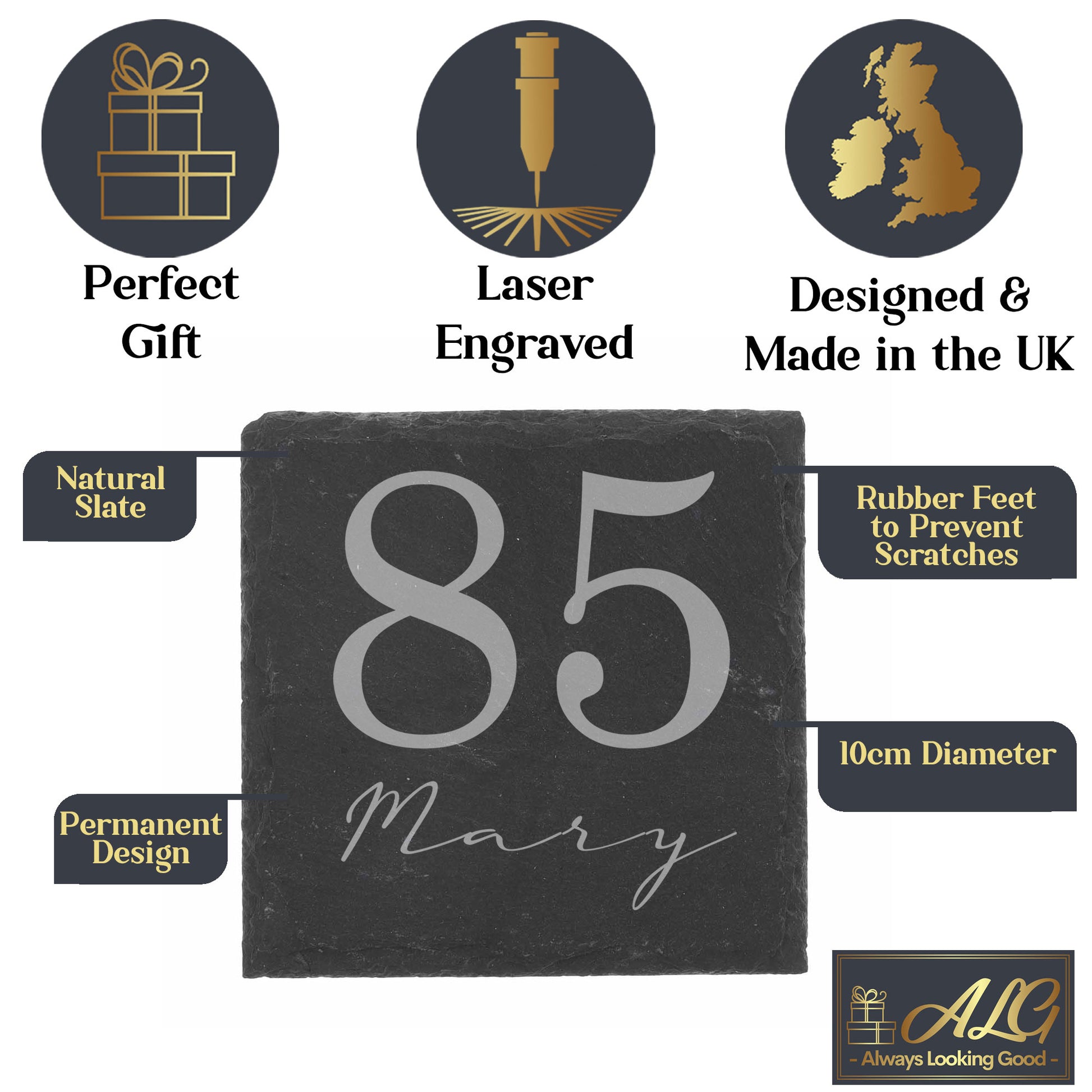 Enhance the gift with a personalised slate coaster, available in square (10x10cm) or round (10cm diameter) options. Each coaster is crafted from natural slate with hand-cut edges, making every piece unique. Engraved to match the pint glass, the coaster features soft padded feet to protect surfaces, perfect for their desk, coffee table, or home bar.